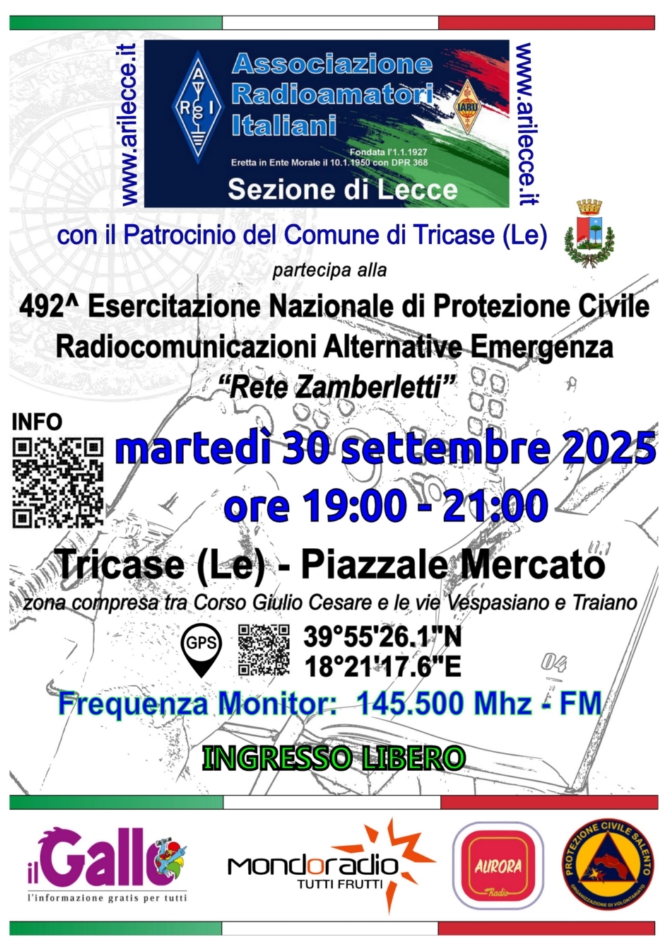 di Gianluca Eremita, IW7DAX - Martedì 30 settembre, a seguito della convocazione da parte della Prefettura di Lecce, la Sezione di Lecce dell'A.R.I.-Associazione RadioAmatori Italiani prenderà parte alla 492esima Esercitazione Nazionale della "Rete Zamberletti", la Rete delle Radiocomunicazioni Alternative di Emergenza delle Prefetture.